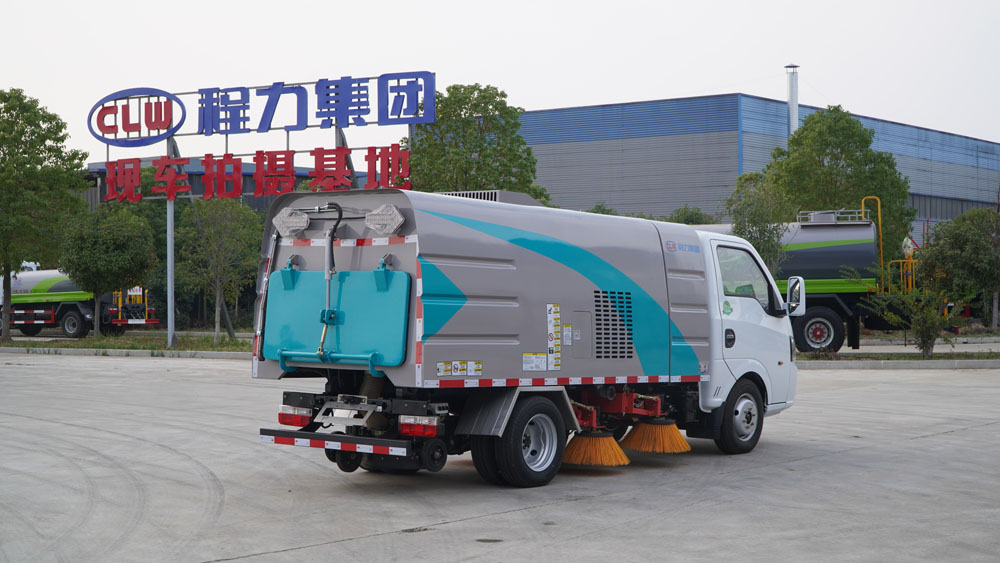 3、掃路車采用東風(fēng)純電動(dòng)二類汽車底盤改裝,加裝風(fēng)機(jī)、清水箱、垃圾箱、左右立掃、帶噴水桿的寬吸嘴、掃盤降塵系統(tǒng)、液壓系統(tǒng)、專用裝置電控系統(tǒng)和副車架等改裝而成。