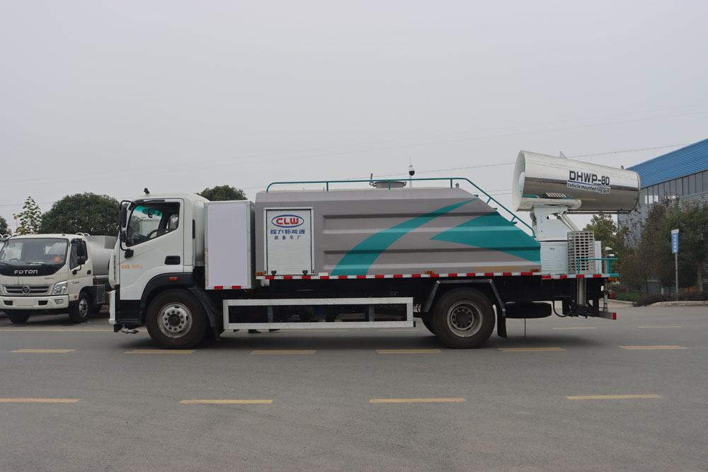 四、其他說明: 福田純電動多功能抑塵車是在純電動二類底盤的基礎上,加裝低壓沖洗、灑水系統、霧炮機組,由機械、液壓(氣路)、電器三部分合為一體的專用灑水作業車。 采用自吸式雙級離心泵,效率高、灑水寬度大、水槍射程遠,低壓水泵由底盤變速器取力器通過傳動軸直接傳動。霧炮機組由底盤電池帶動霧炮風扇電機、不銹鋼多級離心泵,進行噴霧降塵工作。